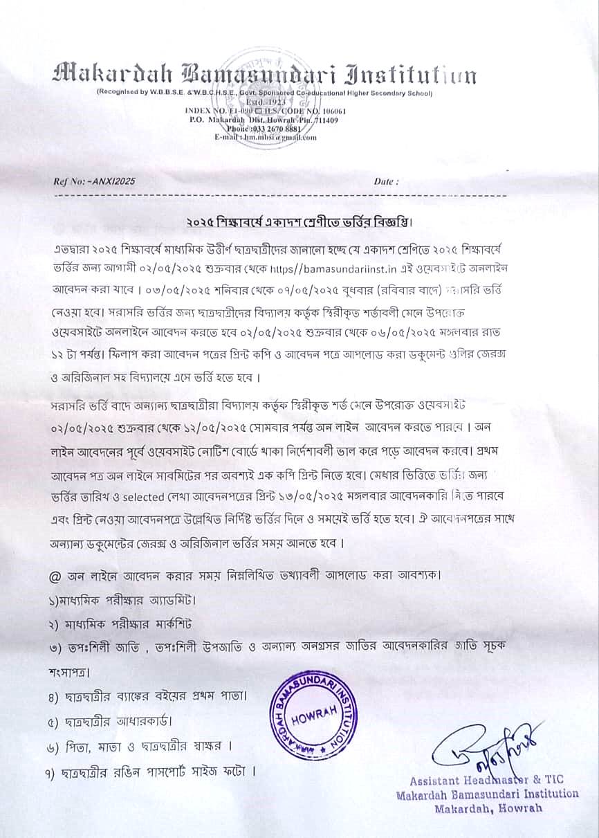Online Application For Class XI, 2025